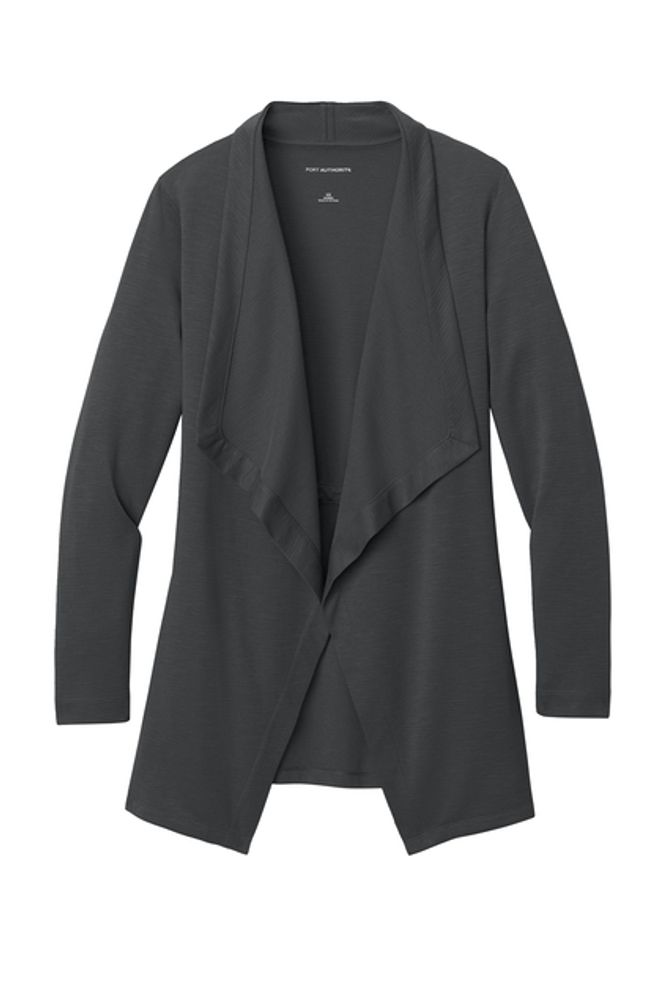 • This crowd-pleasing cardigan, with its subtle slub texture, offers a carefree layering option for the office or any casual setting. • 6.3-ounce, 60/40 cotton/polyester • Open front • Shawl collar with waterfall lapels • Set-in sleeves • Side seam pockets • Elastic at back waist for subtle shaping • Self-turned cuffs and hem